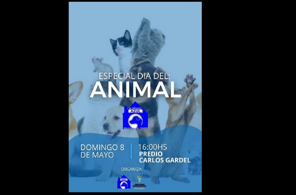 El pasado 29 de abril fue el día de los animales, en ese sentido, este domingo 8 de mayo se harán los festejos para conmemorar la jornada que se merecen las mascotas en la ciudad de Villa Ángela. Los mismos se llevaran a cabo en el Predio Carlos Gardel a cargo de la organización “Refugio Azul”.