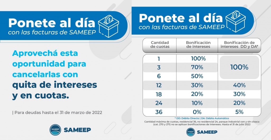Se trata de distintas moratorias destinadas a quienes se encuentren en situación de deuda al 31 de marzo de 2022. Los usuarios que deseen adherirse al plan de financiación pueden hacerlo de manera presencial según la opción de pago seleccionada y los medios de pago existentes. Además, desde el sitio web de Sameep: sameep.gob.ar/facturas es posible consultar las facturas adeudadas.