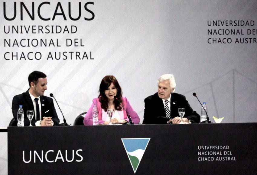 La vicepresidente Cristina Kirchner visitó Chaco esta tarde de viernes para recibir el Doctorado Honoris Causa de la Universidad Nacional del Chaco Austral. En el Centro de Convenciones Gala, a partir de las 17, la ex presidente encabezó junto al rector Germán Oestmann y al vice rector Manuel García Solá, una Conferencia Magistral sobre "Estado, Poder y Sociedad: la insuficiencia democrática".