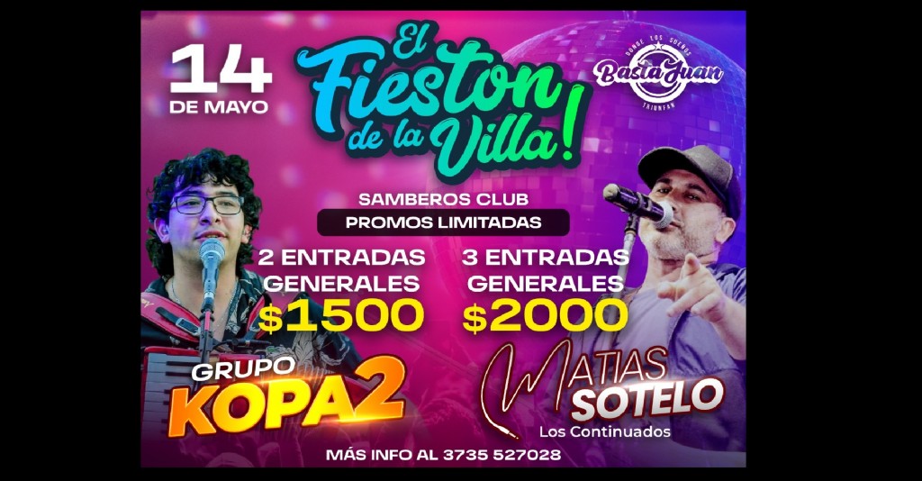 "FUROR POR EL FIESTON DE LA VILLA", el evento que se realiza este sábado 14 de mayo en el SAMBEROS CLUB, donde actuarán en vivo GRUPO KOPA2 Y MATIAS SOTELO Y LOS CONTINUADOS.