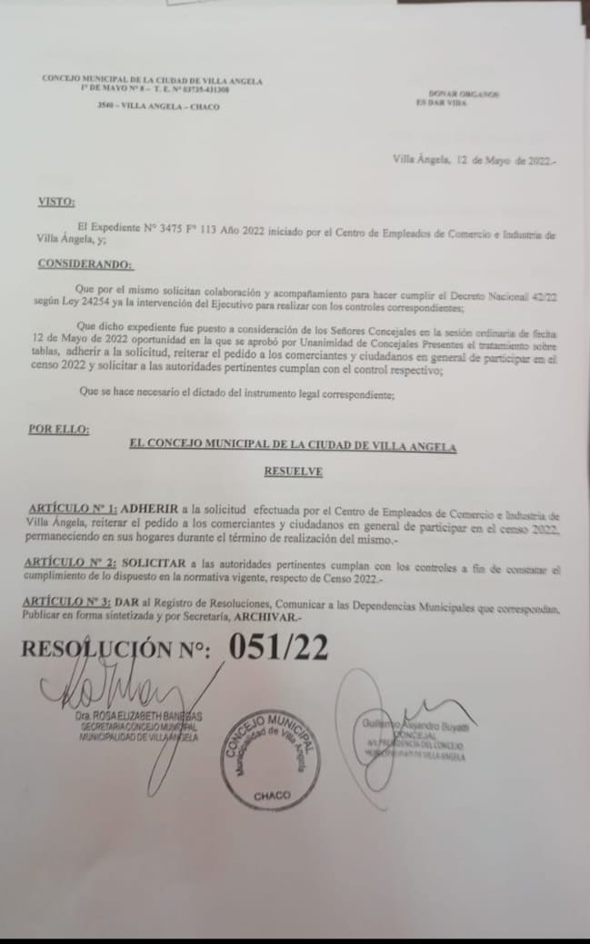 Mediante el resolución 051/22 del Concejo deliberante en donde adhiere a la solicitud efectuada por el Centro de Empleados de Comercio e Industria de Villa Ángela, de reiterar el pedido a los comerciantes y ciudadanos en general de participar en el censo 2022 permaneciendo en sus hogares durante el término de realización del mismo.