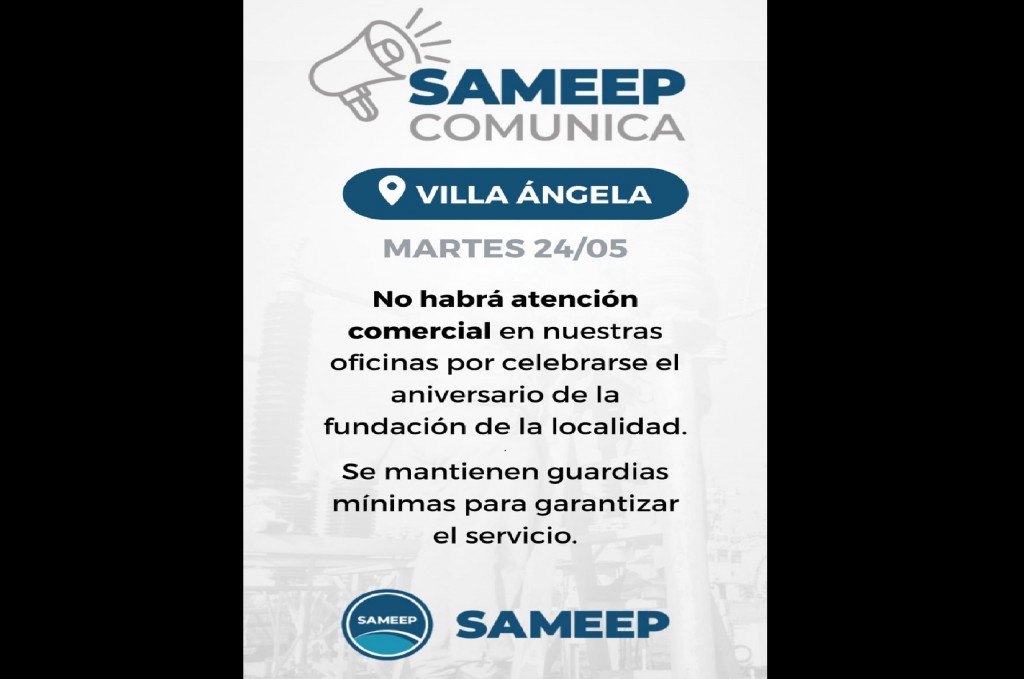 Desde Sameep se comunicó que en el día de mañana no habrá atención comercial en la ciudad de Villa Ángela, por celebrarse el aniversario de la fundación de dicha localidad.
