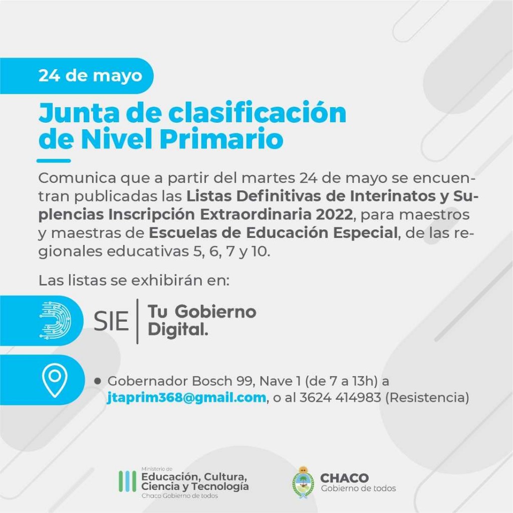 El Ministerio de Educación del Chaco, a través de la Junta de Clasificación de Nivel Primario, comunica que, a partir de este martes 24 de mayo, se encuentran publicadas las listas definitivas de interinatos y suplencias inscripción extraordinaria 2022, para maestras y maestros de Escuelas de Educación Especial, de las regionales educativas 5, 6, 7 y 10.