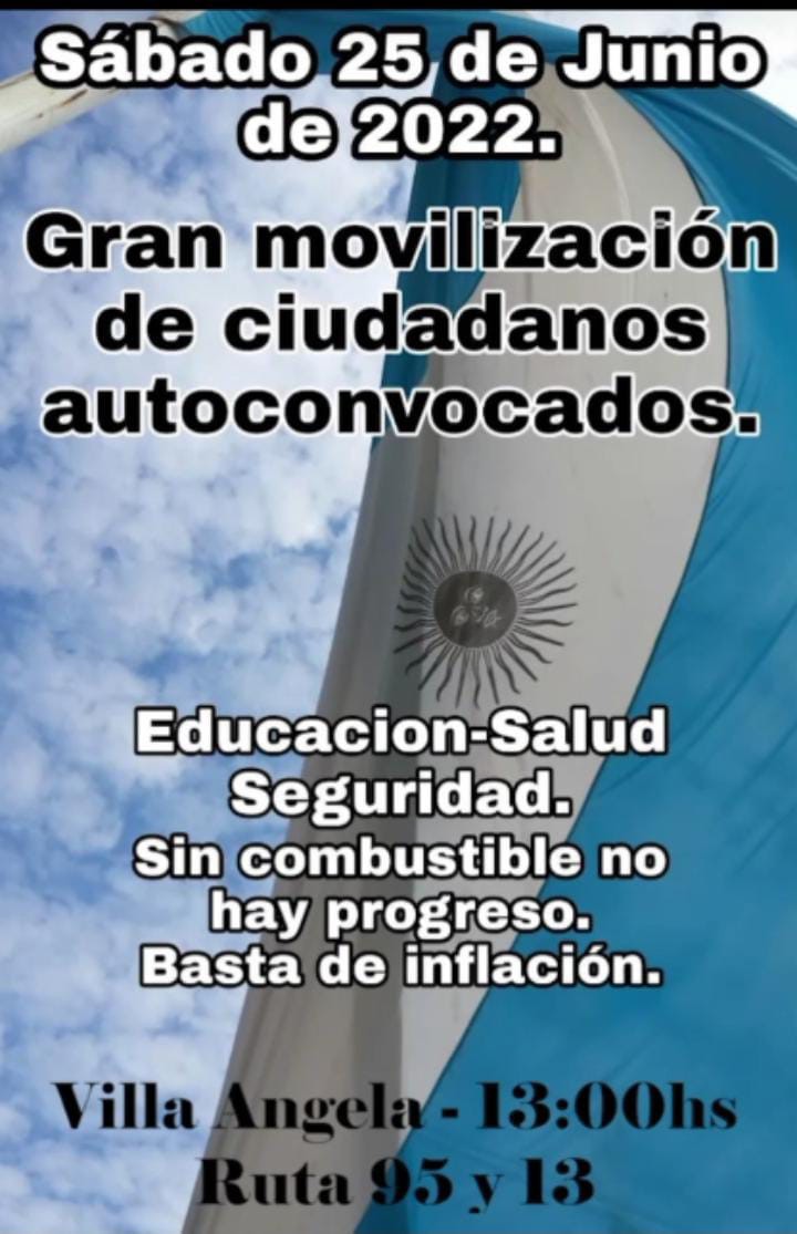 Desde la localidad de Villa �ngela se hizo el llamado a aquellos agropecuarios, productores, y comerciantes que sean v�ctimas de la escases de dicho combustible para marchar en forma de caravana en sus veh�culos Ma�ana, s�bado a las 13 desde la Rotonda de Ruta 95 y 13, para llegar a la rotonda de Ruta 16 y calle 12 en la localidad de S�ez Pe�a a las 15 con la bandera Argentina como identificaci�n.