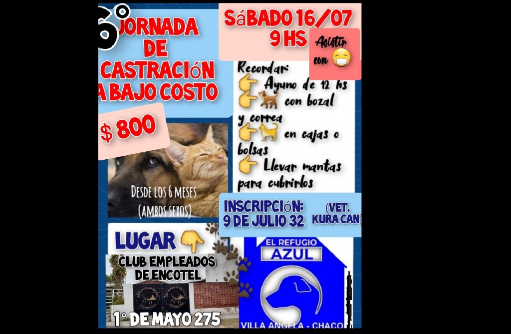 La Municipalidad de Villa Ángela acompaña al Refugio Azul en la 6° jornada de castración 2022, intervención que se realizará a bajo costo, en gatos y perros el sábado 16 de julio a partir de las 9:00 en el Club de Empleados de Encotel ubicado en la calle 1° de Mayo 275.