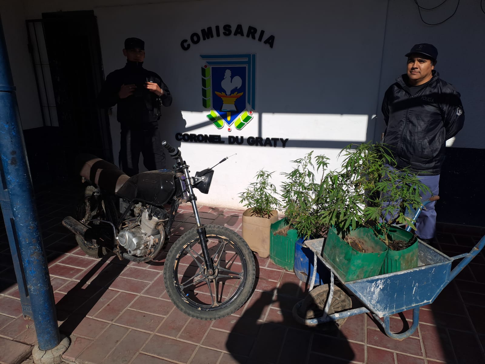 El viernes en horas cercanas al medio día, agentes policiales de la localidad de Coronel Du Graty, recorrían de manera preventiva la Colonia Las Golondrinas en zona rural, cuando ven dos personas que circulaban en una moto 125 cilindradas y que llevaban un carretilla con plantas de dudosa procedencia.