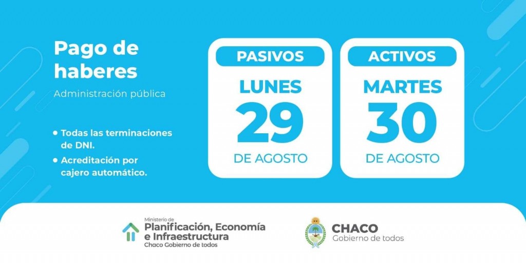 Para el caso de los trabajadores activos y pasivos, el próximo lunes 29, se pagarán los haberes de las y los jubilados y el martes 30, será el turno de las y los trabajadores activos de la Administración Pública. Estarán depositados en los cajeros automáticos del Nuevo Banco del Chaco, a partir de las 21 del día correspondiente. Un día después, podrán cobrar por las ventanillas de las sucursales habilitadas.