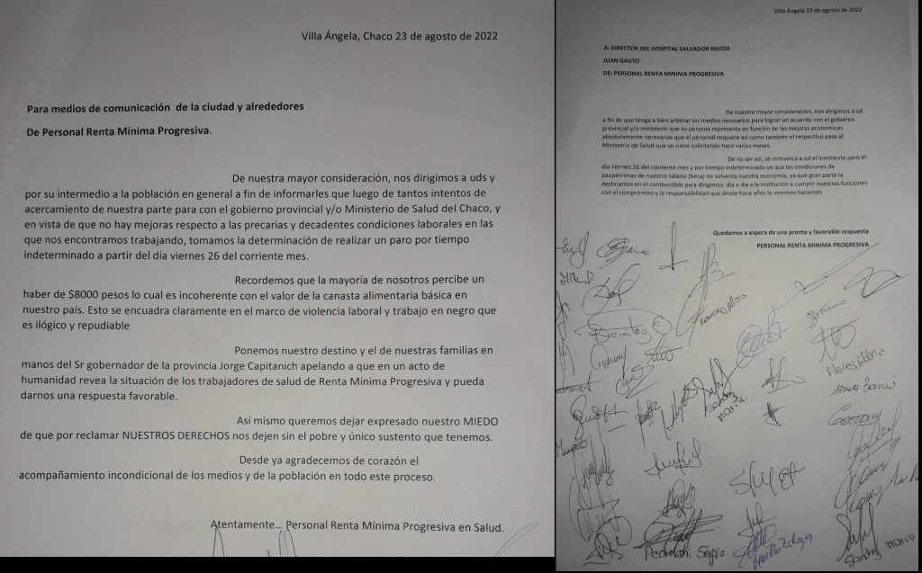 En este sentido, los trabajadores de Renta Mínima Progresiva, que hace meses vienen en la lucha de mejoras salariales y que se blanquee su situación laboral, solicitaron a la dirección del hospital “Salvador Mazza”, arbitre los medios necesarios para que llegar a una solución sobre su situación.