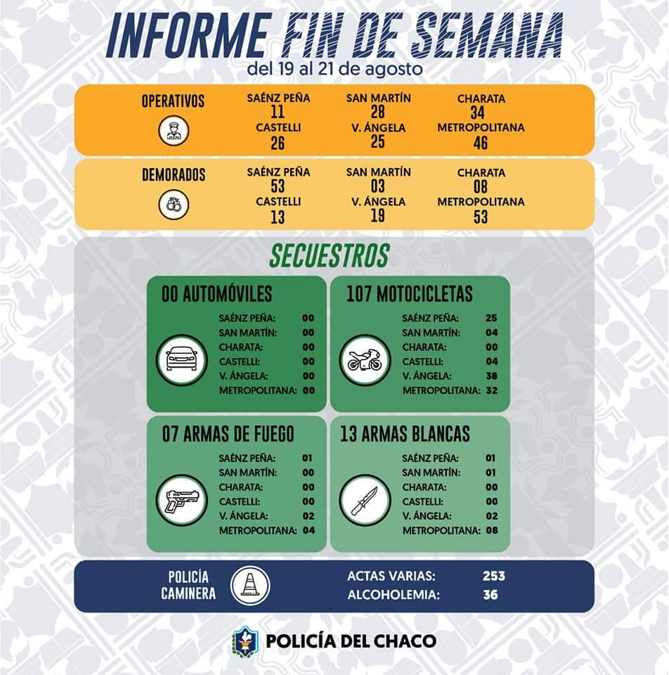 En Villa Ángela se registraron 25 operativos con 19 individuos demorados por el cuerpo policial.