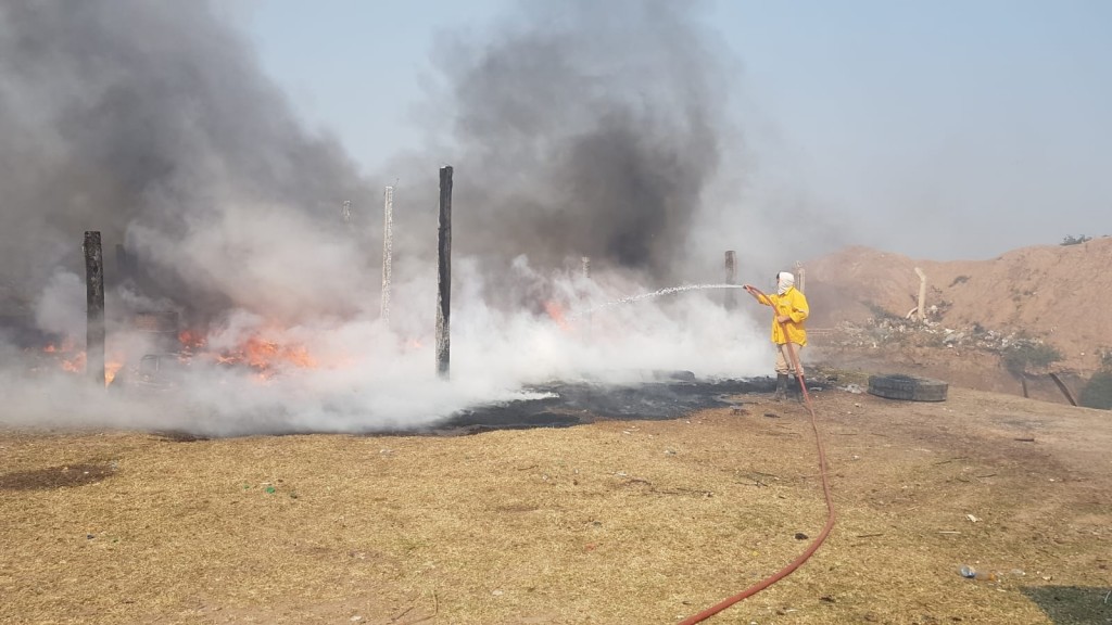 Una vez allí se observó un incendio declarado sobre fardos de botellas de plásticos, por lo cual el personal concurrente procedió a la extinción y refrigeración del proceso combustivo mediante el arrojo de agua a presión, procedente de una línea de ataque de 1”; el fuego en su accionar provocó la destrucción de fardos de botellas de plásticos reciclados, de 10 mts de frente por 6 mts de fondo y 2 mts de alto.