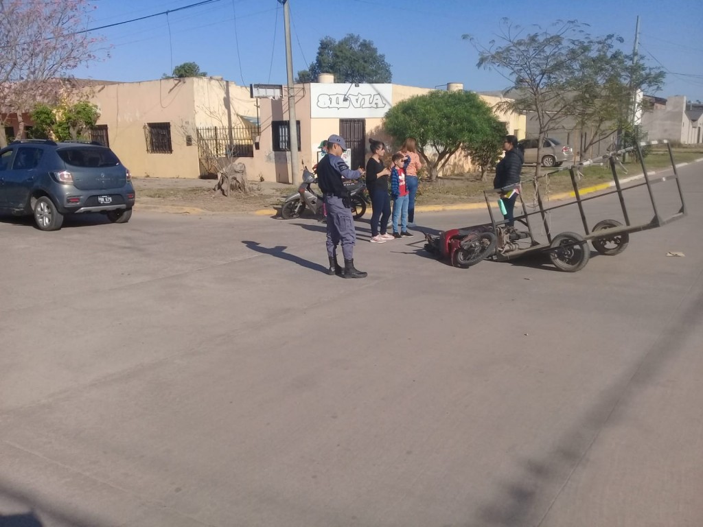 A las 17.15 de éste sábado se constata de un accidente de tránsito entre las Calles 9 de Julio y Nicolás Matienzo, siendo participe: (1) automóvil Marca Renault , Modelo Sandero Stepway, color gris, guiado por “E. S”, mujer de 53 años de edad, radicada en B° Verdad, resultando Ilesa; y (1) motocicleta Marca Gilera, modelo Smash110cc color rojo guiada por “M. R. N.”, colombiana, de 22 años.