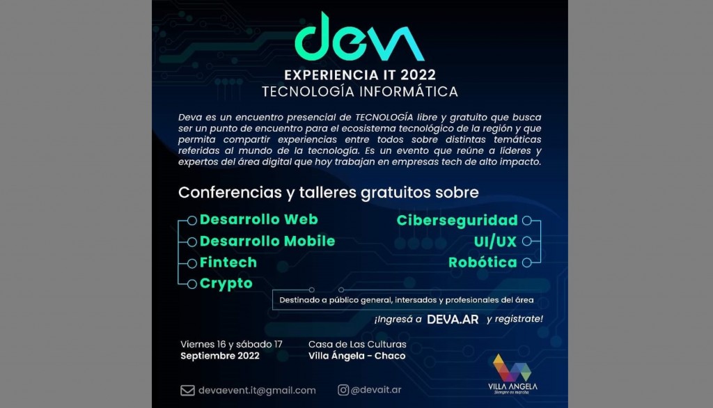 La Municipalidad de Villa Ángela en coordinación con el equipo de Punto Digital llevará a cabo el 1° Encuentro presencial de tecnología libre y gratuita "Deva". La actividad tiene como objetivo reunir a desarrolladores informáticos en el marco del Día del Programador quienes, al mismo tiempo, podrán compartir experiencias sobre las diferentes temáticas de la tecnología.