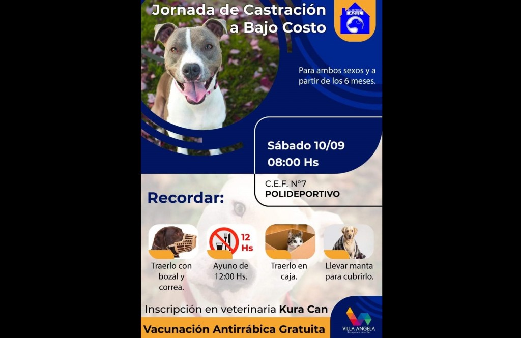 La Municipalidad de Villa Ángela acompaña al Refugio Azul a la nueva jornada de castración de perros y gatos a bajo costo a realizarse el sábado 10 de septiembre en el polideportivo de la ciudad. La actividad comenzará a las 8:00 y se atenderá mediante inscripción previa.