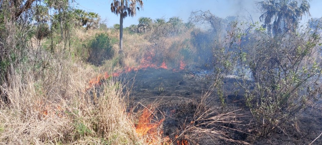 Se constituyó al lugar una dotación a cargo del Sargento Primero Pol. CRISTIAN BOX, en Móvil identificada como PT-351 observándose fuego sobre pasto seco, arbusto y árboles, ante ello el personal concurrente realizó la total extinción del incendio mediante el uso de mochilas hidrantes y de hisopos.