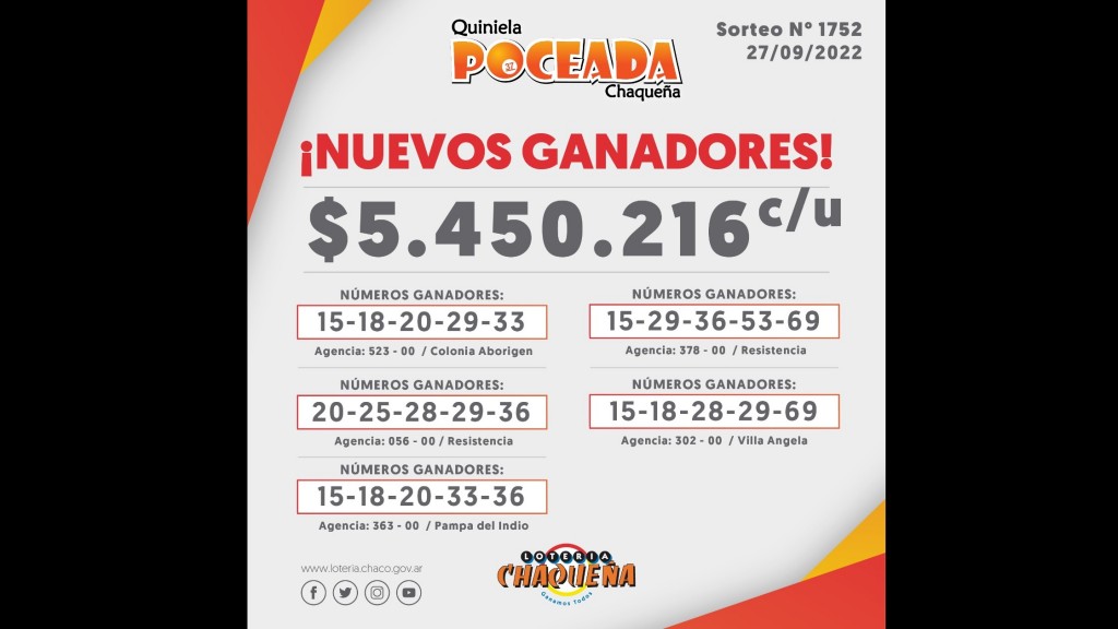 Los ganadores se llevaron $4.450.216,00 cada uno, son dos de Resistencia, uno de Colonia Aborigen, otro de Pampa del Indio y otro de Villa Ángela.