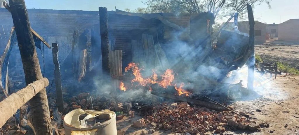La casa de construcción precaria, compuesta de chapas y madera, quedó totalmente destruida por el fuego y la familia perdió pertenencias personales. En tanto, no se informaron personas heridas.