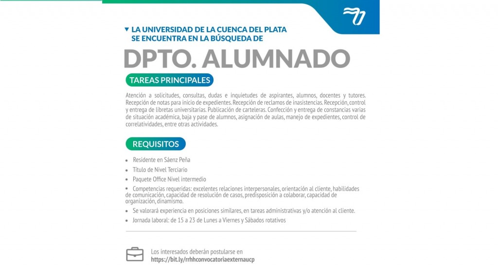 La Universidad de la Cuenca del Plata - Sede Regional Saenz Peña, invita a interesados que cumplan los requisitos a la convocatoria externa para cubrir el puesto en Departamento de Alumnado.