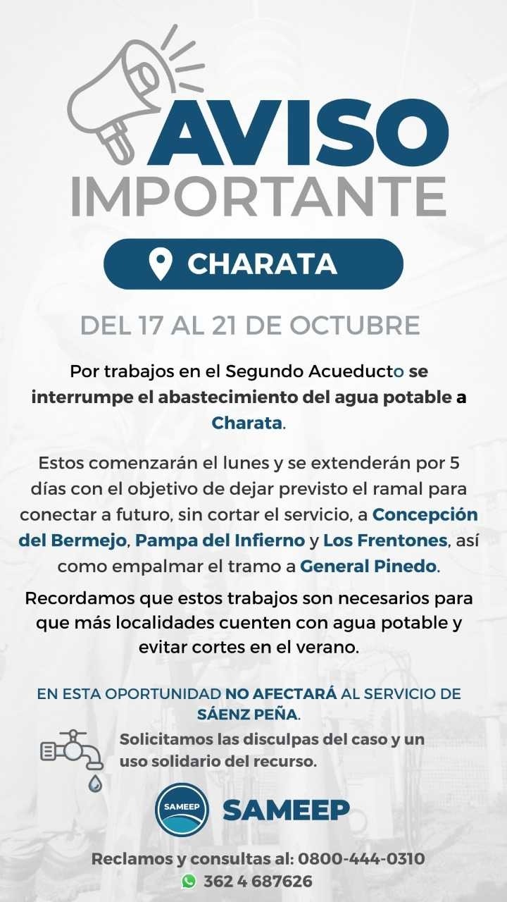 La empresa provincial Sameep informó este viernes que del 17 al 21 de octubre será interrumpido el abastecimiento de agua potable a la ciudad de Charata, por trabajos que se realizarán en el Segundo Acueducto. Así, detallaron que los trabajos comenzarán el lunes próximo y se extenderán por cinco días, con el objetivo de dejar previsto el ramal para conectar a futuro, sin cortar el servicio, a Concepción del Bermejo, Pampa del Infierno, Los Frentones y General Pinedo.