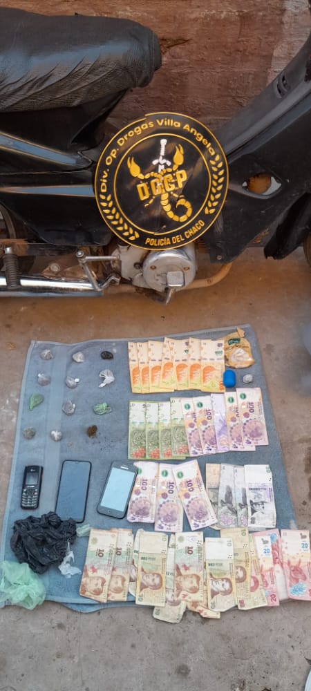 Como parte de la investigaci�n secuestraron dinero en efectivo, tres celulares, una moto y un esf�rico de color azul, con restos de coca�na. Conforme a lo dispuesto por la Fiscalia interviniente se procedi� al traslado del detenido y los secuestros a la unidad, donde se iniciaron las actuaciones judiciales por ?Supuesta Infracci�n a la Ley N� 23737 en funci�n de la Ley Provincial N� 2304-N (Narcomenudeo)-.