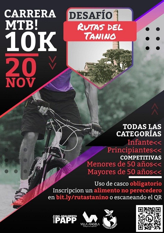 La secretaría de cultura, turismo y deportes, en conjunto con medio ambiente se encuentran diagramando y organizando la carrera de bicicletas MTB a desarrollarse el 20 de noviembre en un circuito trazado en los terrenos de la ex fábrica de taninos La Chaqueña. La inscripción se la puede realizar en forma presencial o escaneando el QR y la condición es llevar un alimento no perecedero.
