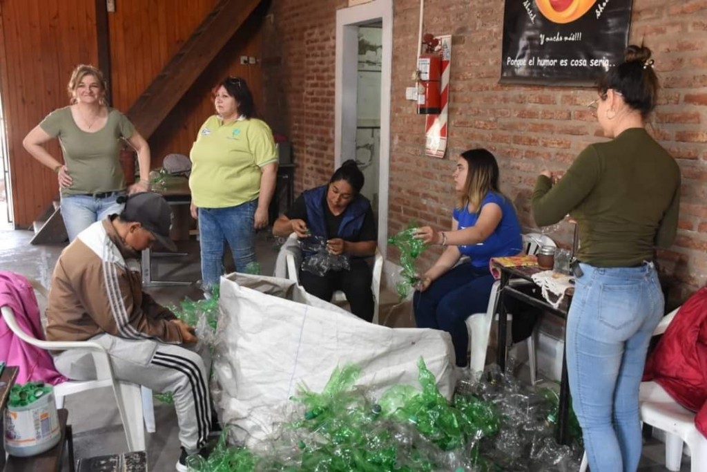 Viviana Ponce de León, secretaria de Ambiente y Municipios Saludables, desde el Teatro Plaza expresó: "Hoy nos encontramos en este lugar dónde los espacios son grandes y podemos trabajar de forma cómoda con las botellas recicladas que ya se encuentran seleccionadas y cortadas según medidas, por lo que resta armar las estructuras, coser las botellas, forrarlas y pintarlas".