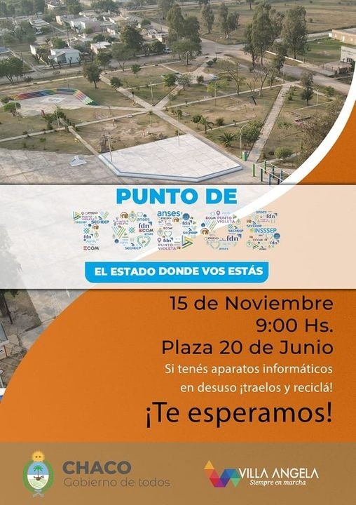 La Municipalidad de Villa Ángela informa a toda la comunidad que el Operativo Integral "Punto de Todos" se realizará el martes 15 de noviembre de 9:00 a 13:00 en la plazoleta "20 de Junio" ubicada en el barrio 279 Viviendas. La jornada tendrá como objetivo que los vecinos puedan realizar trámites, gestiones y consultas sobre servicios, programas y planes, además de entregar aparatos electrónicos en desuso para su posterior reciclado.