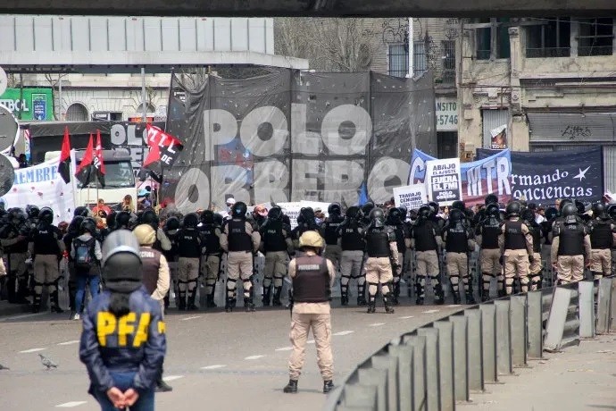 Los manifestantes de UP se habían concentrado en distintos puntos del centro porteño para luego marchar a la sede del Ministerio de Desarrollo Social, donde solicitaron una reunión con la titular de esa cartera para pedirle un bono de emergencia y que el pago del programa Potenciar Trabajo “no se desenganche del salario mínimo”.