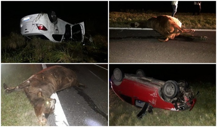 Según informó la Policía el choque múltiple se produjo cuando el Chevrolet colisiona contra una vaca y a su vez, el Palio que venía detrás, impacta contra el el mismo animal, lo que provocó que ambos vehículos terminen sobre la banquina tras dar un vuelco.
