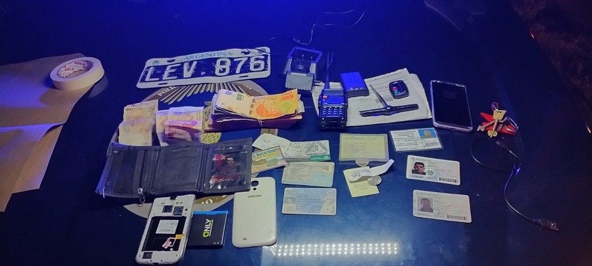 En conjunto con la Policía Federal Argentina, personal de Comisaría La Tigra a cargo del Jefe Subcrio. OMAR VILAQUI y la División Investigaciones Villa Ángela con el Jefe de Dpto. de Investigaciones Interior Crio. Insp. Luis ALEGRE, procedió a la revisión en presencia de testigo del automóvil previa consulta y conforme lo ordenado por el Fiscal Gustavo VALERO y en el interior del vehiculó se observó (01) Ganzua tipo T; un (01) control remoto a distancia; un (01) Radio portátil con frecuencia VHF con respectivo base cargador que se usa de inhibidor, una (01) batería de radio portátil de repuesto; una (01) Chapa patente dominio LEV 876; la suma de dinero en efectivo Pesos Argentinos $147.050 discriminados en varios billetes; dos (02) Teléfonos celulares con respectivo Chip de la compañía Personal; una (01) Cedula de Moto vehículo, una (01) Cedula de identificación de automotor mencionado; cuatro (04) Fotocopias de formulario 08; un (01) título del automotor.