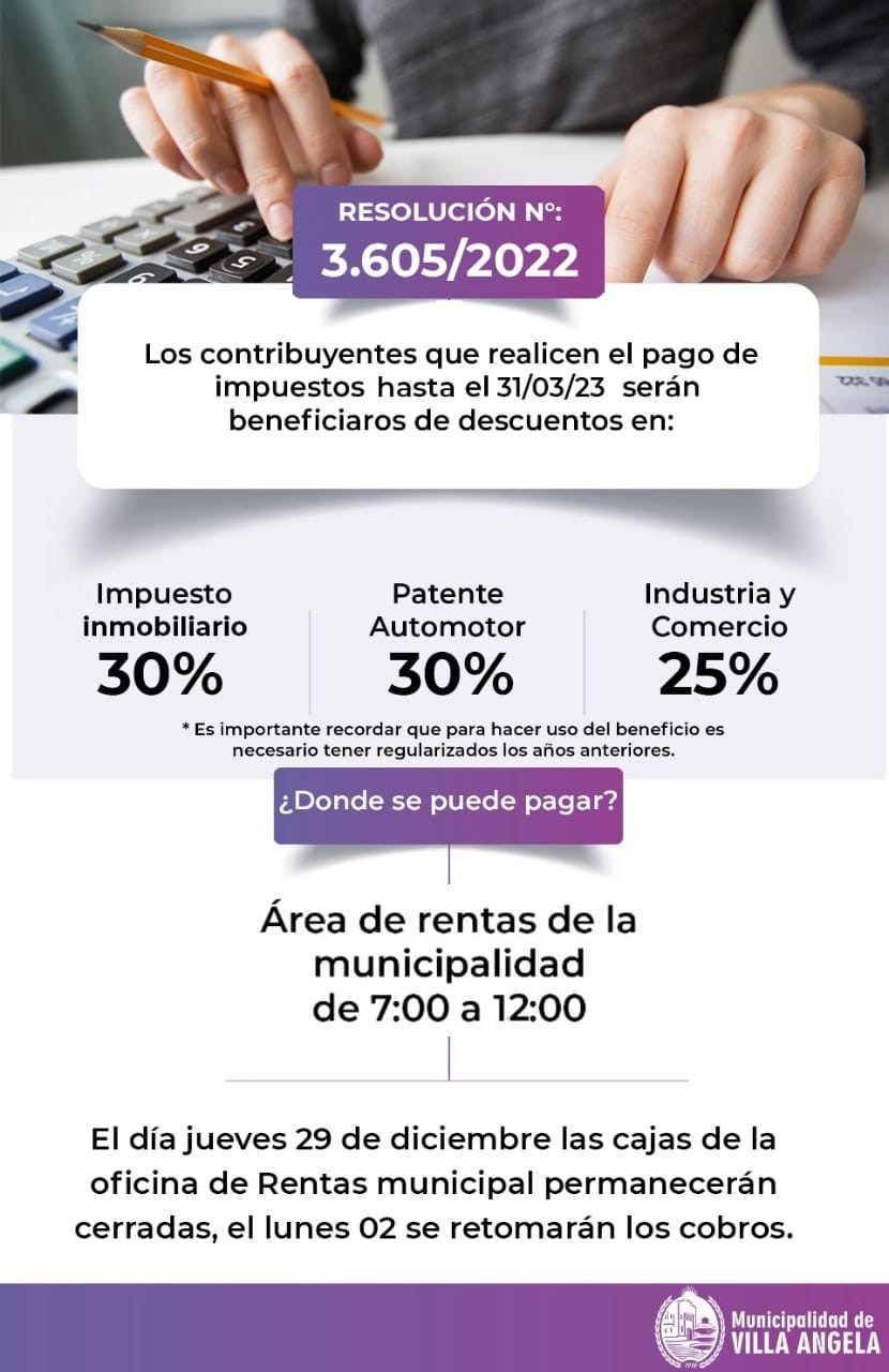 Villa Ángela: LA SECRETARÍA DE ECONOMIA Y FINANZAS INFORMÓ SOBRE FECHA DE COBRO, LA NUEVA ORDENANZA IMPOSITIVA Y DESCUENTOS EN SERVICIOS