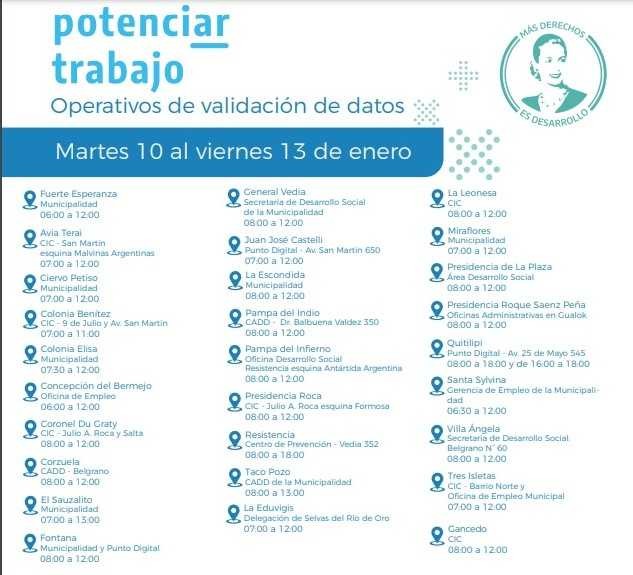 En una tarea conjunta entre el Ministerio de Desarrollo Social y varios municipios del interior chaqueño, desde este martes 10 de enero, se dispondrán de puntos de gestión o postas para que titulares del programa Potenciar Trabajo que aún no hicieron el trámite online, se acerquen a la convocatoria dispuesta para la validación de datos, condición necesaria para preservar la prestación.