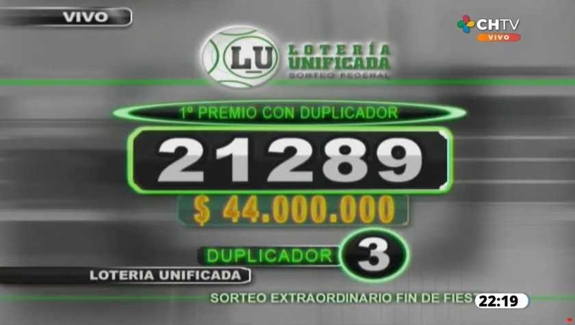 El Sorteo Extraordinario de Fin de Fiestas, de la Lotería Unificada, tuvo lugar este sábado a las 22 desde la Sala de Sorteos de la Lotería Neuquina, con transmisión de Chaco TV.