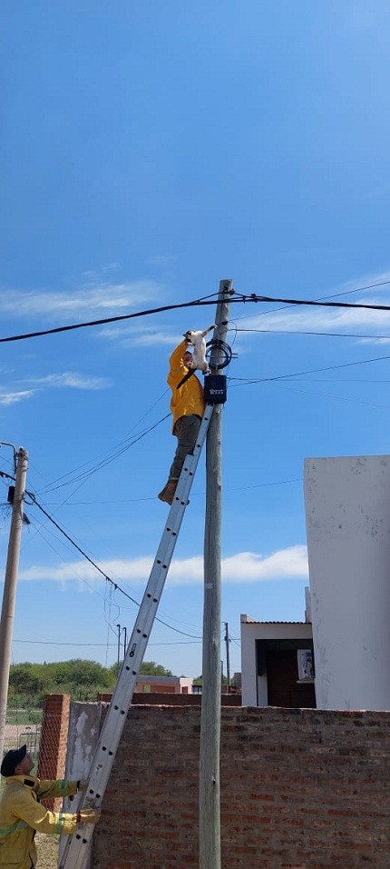 Villa Ángela: BOMBEROS RESCATARON UN GATO SIAMÉS QUE SE ENCONTRABA TREPADO EN UN POSTE DE LUZ