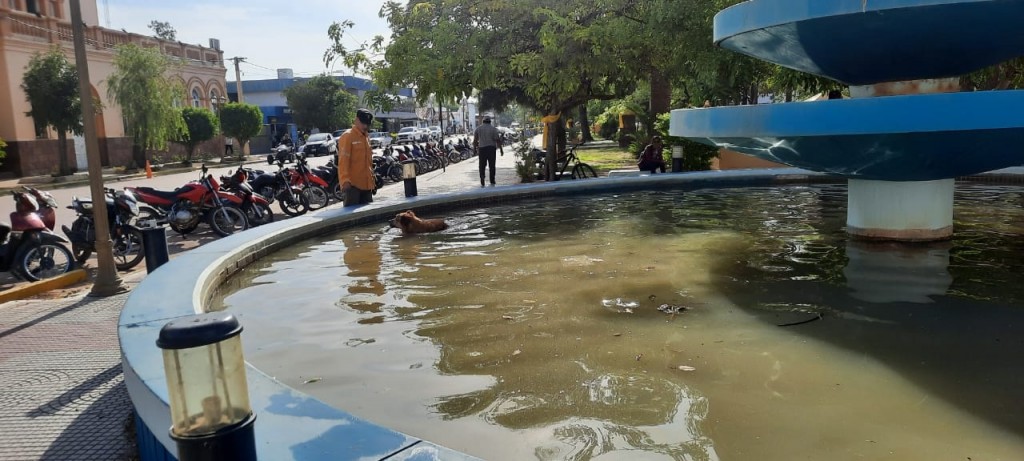 Villa Ángela: DIVISIÓN DE BOMBEROS RESCATÓ A UN CANINO QUE NO PODÍA SALIR DE LA FUENTE EN LA PLAZA CENTRAL