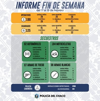 Es así que durante estos tres días los agentes de las diferentes direcciones de zona, en lo que va del Fin de semana largo, ya llevaron a cabo casi 200 operativos de prevención, debido al gran despliegue policial se secuestraron 8 armas blancas, 7 armas de fuego, 184 motocicletas de las cuales 7 tenían pedido activo de secuestro y hubo 125 personas detenidas por cometer diferentes delitos e infringir el Código de Faltas Provincial.