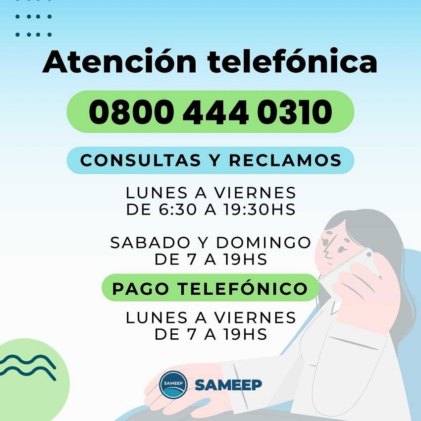 El Servicio de Agua y Mantenimiento, Empresa del Estado Provincial (Sameep) recordó su línea telefónica 0800. Con horarios extendidos, está disponible para que los y las clientes puedan realizar consultas y reclamos.