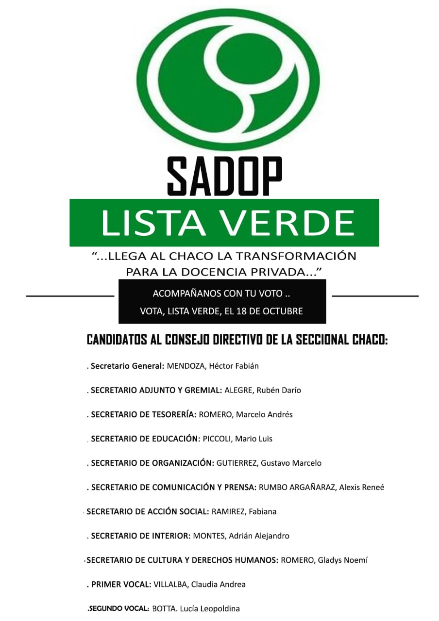 Adrian, junto a la lista verde apuestan la lucha por la situación del docente privado en donde actualmente y con la gestión actual, estan adeudando 6 meses en las cargas sociales, en donde los docentes privados se ven totalmente desprotegidos en materia de salud, reconocen que existen algunas escuelas de gestión privada se pusieron al hombro tratar de cubrir estas cargas sociales para ayudar a sus docentes, pero la gran pregunta es, si todas ese dinero fue descontado para cubrir las cargas sociales de los docentes, DONDE ESTÁ?