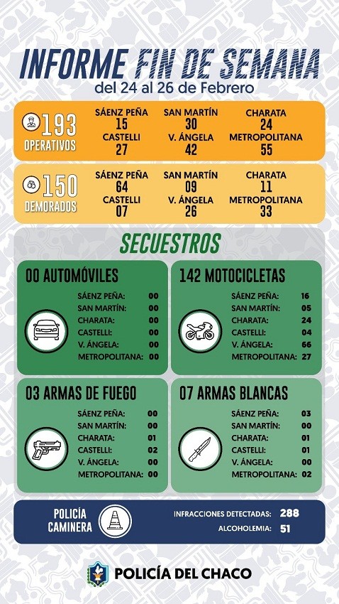 Tras finalizar los 193 operativos que comenzaron el viernes a la noche y finalizaron el domingo, el personal demoró a 150 ciudadanos que cometieron infracciones al código de faltas y al código penal, y secuestraron 142 motocicletas, 3 armas de fuego y 7 armas blancas.
