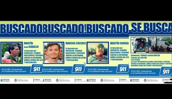 La Policía del Chaco intensifica operativo de búsqueda para dar con los paraderos de Martín Correa, Martín alias "Caballo", Marcos Cáceres, por supuestas lesiones, resistencia y atentado contra la autoridad; daños a bienes del Estado y particulares en los incidentes que ocurrieron el día de ayer en las oficinas del Abordaje Territorial dependiente del Ministerio de Desarrollo Social. Además se busca un vehículo Renault modelo "Master". Se solicita la colaboración a la comunidad por cualquier información llamar al 911.