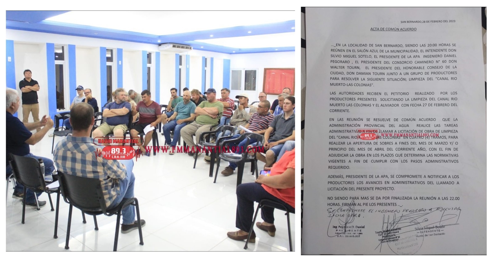 Luego de las tratativas que los productores mantuvieron con el intendente de San Bernardo y autoridades de la APA (Administración Provincial del Agua), Juan Carlos Wedorczyk, informó en #LaMañanaDeManantial que lograron la firma de un acta acuerdo. El cual consiste en llevar adelante la limpieza definitiva del canal “Río Muerto-Las Colonias”.