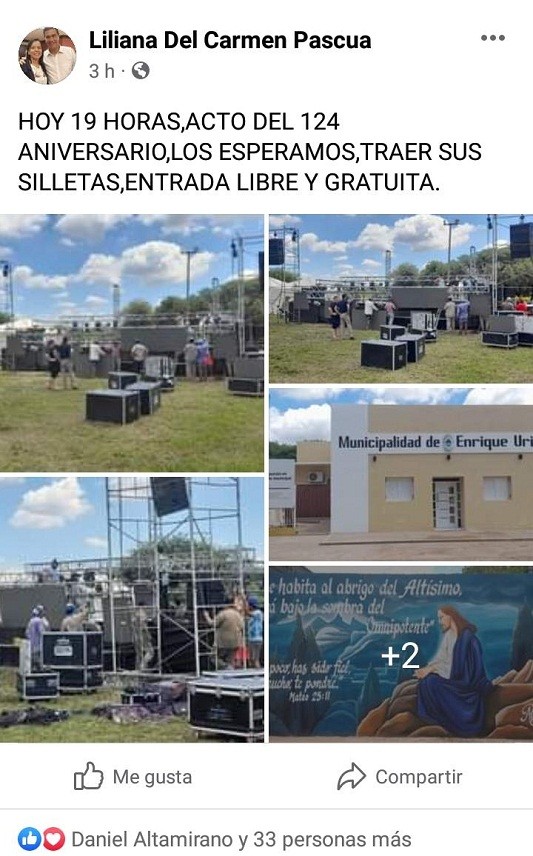 La Intendente Liliana Del Carmen Pascua, invita a toda la comunidad de Enrique Urien y localidades vecinas, a participar de la Gran Fiesta de los 124º Aniversario.
