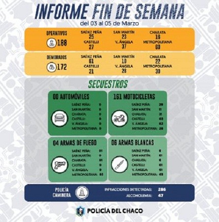 Durante un fin de semana, se realizaron 252 operativos de prevención en el territorio chaqueño. El despliegue incluyó la detención de personas, el secuestro de armas y de vehículos.