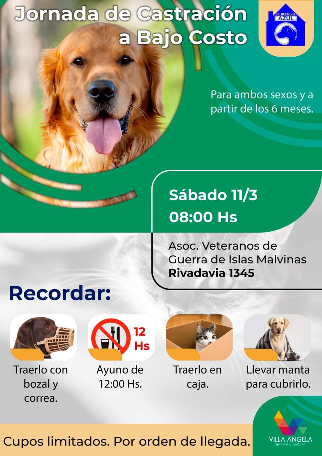 La Municipalidad de Villa Ángela acompaña la 3ra. jornada de castración 2023 organizada por el Refugio Azul la cual se llevará a cabo el sábado 11 de marzo a partir de las 8:00 en el Salón de la Asociación de Veteranos de Malvinas ubicado en Rivadavia 1345. Está destinada a perros y gastos de ambos sexos quienes deben asistir con un ayuno de 8/12 horas, manta y una caja para su traslado pos-operatorio