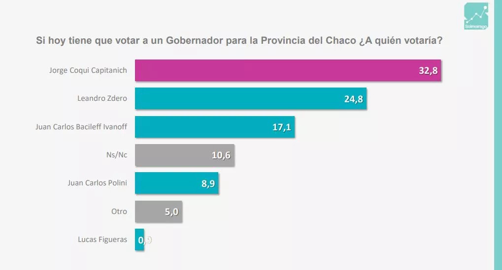 A seis meses de las elecciones generales en el Chaco, Jorge Capitanich aparece como el dirigente político con mayor intención de voto a gobernador, con el 32,8%, seguido por el precandidato Leandro Zdero, quien llega al 24,8%, en base a una encuesta.