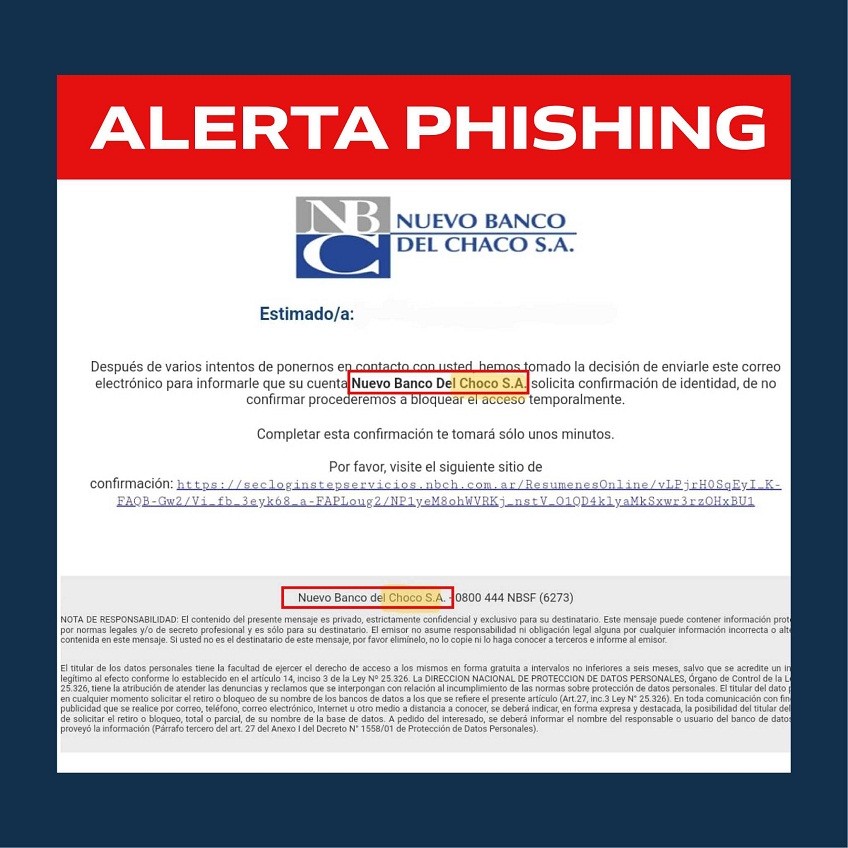Se han reportado recientemente estafas de phishing para robar información de ingreso y contraseñas. No abrir y eliminar inmediatamente correos electrónicos con remitente: “NBCH Mail” y asunto: “Nuevo Banco Del Chaco - Ultimo aviso antes de bloquear su cuenta por falta de confirmaciones”.