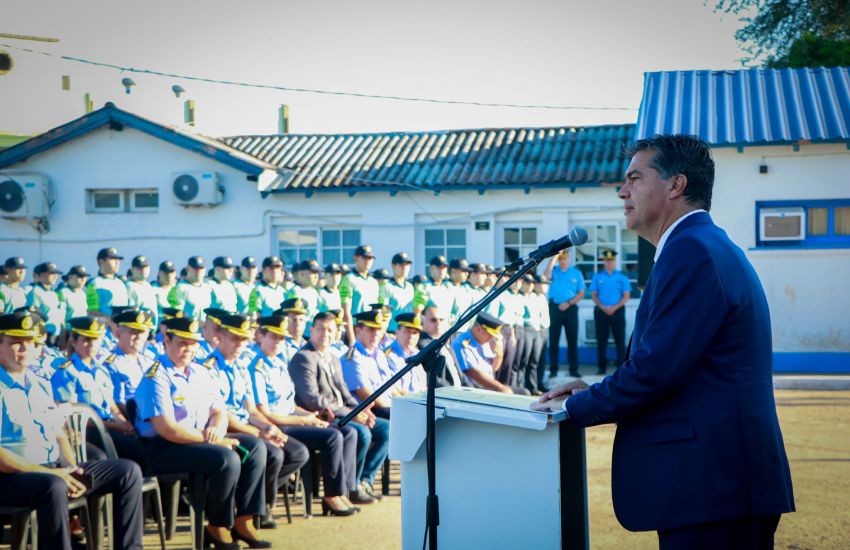 El anuncio lo hizo desde la plaza de Armas de la Policía del Chaco, acompañado de la vicegobernadora Analía Rach Quiroga; de la ministra de Seguridad y Justicia, Gloria Zalazar; del ministro de Educación, Aldo Lineras; del director nacional de Ingresos y Carreras del Ministerio de Seguridad de la Nación, Ariel Legnani y del Jefe de la Policía, Ariel Acuña.