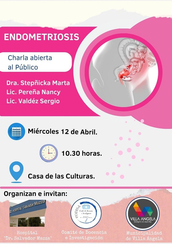 La Secretaría de Desarrollo Social del Municipio de Villa Ángela realizará, el próximo 12 de abril, una charla abierta a todo público en el marco del Día Mundial de la Endometriosis. La actividad está coordinada por la Oficina de la Mujer y el Hospital "Salvador Mazza" y se desarrollará a las 10:30 en la Casa de las Culturas, ubicada en San Martín y Pasteur.