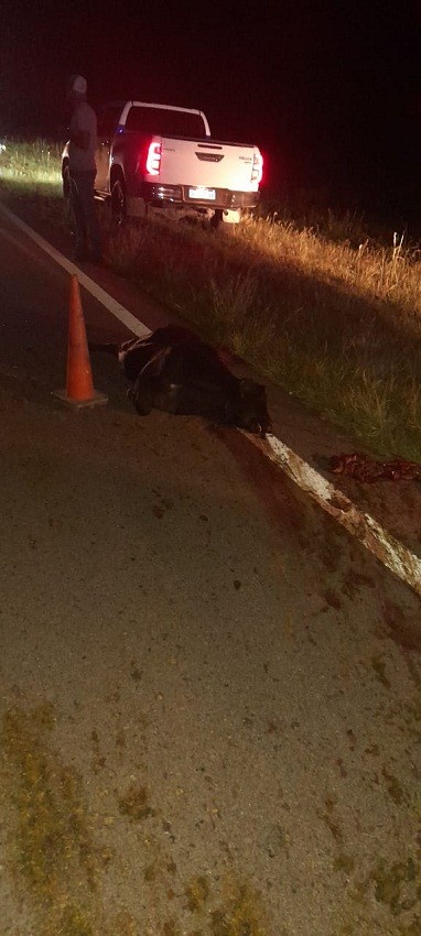 Anoche, alrededor de las 23:10 horas, en camino hacia colonia Peguriel, personal policial de Comisaría Segunda, tomó conocimiento sobre la colisión entre una camioneta Toyota Hilux, color gris, dom., AF725EF, guiada por el ciudadano S. S. A. E., de 32 años, domiciliado en B° 25 viviendas de Coronel Du Graty, quien resultó ileso. Y la otra parte, un animal vacuno categoría ternera, pelaje negro, de 120 kg en pie, la cual se hallaba sin vida a la vera de la cinta asfáltica (Ruta Nº95 Km 1006).