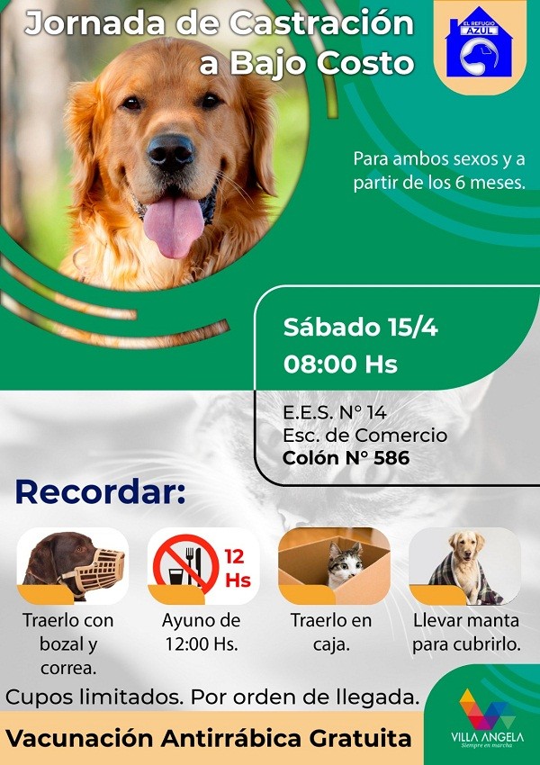 La Municipalidad de Villa Ángela acompaña la 4 ta., jornada de castración a bajo costo de caninos y felinos, organizada por el Refugio Azul. La actividad se llevará a cabo el sábado 14 de abril a partir de las 8:00 en la Escuela Secundaria N° 14 (Comercio) ubicada en Colón 586.