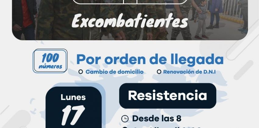 El Ministerio de Gobierno y Trabajo, a través de la Dirección General del Registro Civil, realizará este lunes 17 de abril un operativo de DNI gratuito para todos los excombatientes en la ciudad de Resistencia. Se llevará a cabo en el Museo de Malvinas, ubicado en la avenida Alberdi 2100, a partir de las 8.